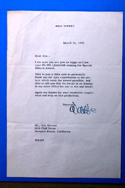 | There are so many things that make this autograph awesome. One, it is my very first autographed letter on Walt Disney's letterhead. Two, it is related to the movie 20,000 Leagues Under the Sea, which is one of my all time favorite movies. And three, I got this letter from the grand daughter of Jim Havens, the director of the Squid Sequence. She even had these story boards where you can see completed scenes and edits. This was added to my collection in June 09 |