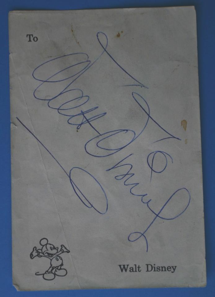 | Still think this is one of the coolest Walt Disney Autographs to own. I have one on the previous page but it was folded twice and has the crease. While this one wasn't folded it has a couple stains on it. The seller called me in December 2009 on this and fortunately we were able to agree on a deal. I like the idea that Walt Disney sat at his desk and signed the various pages in the notepad, put the entire pad in his pocket and walked into Disneyland prepared to peel off a page when he was approached. |