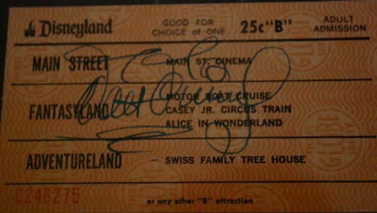 | Disneyland "B" Ticket - I am a big fan of any Walt Disney signed Disneyland item. This ticket was one of the first Disneyland items I ever purchased. I always imagined that the person saw Walt walking down main street, or sitting in the Carnation Restaurant, and asked him to sign it. The ticket is in great shape. It is unique in that Walt usually signed tickets on the back side, so as not to cover any printed information. |
