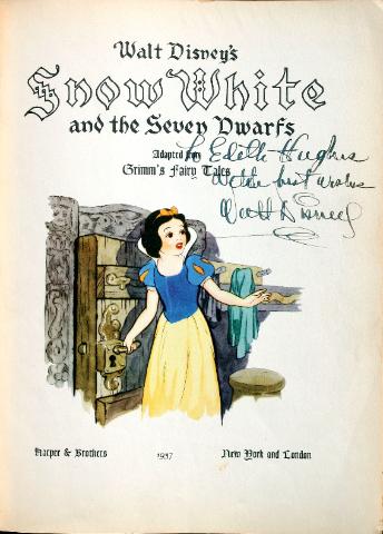 | Snow White - 1937 Based on the copy write of the book, and the fountain pen looking autograph, I believe this is my oldest autograph in my collection. It was always interesting to me, to see how Walt Disney's autograph had changed over the years, yet how in other ways he remained the same. Why you can't tell in these photos, this is actually one of the largest of the books in my collection. As is the case with so many of my things, I don't have any history on the autograph. |