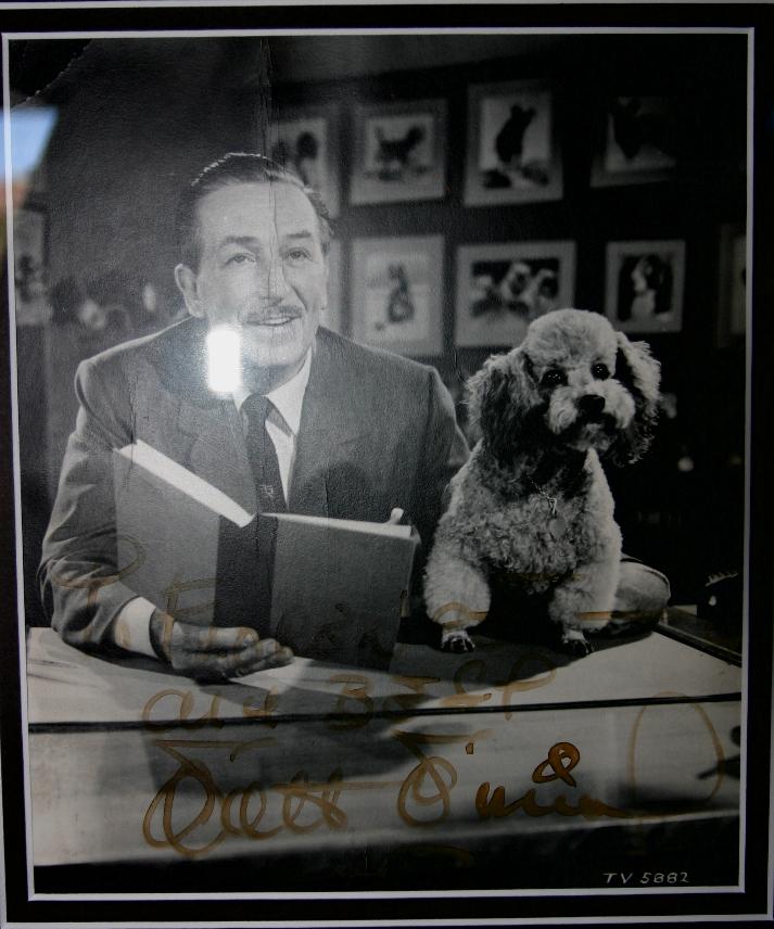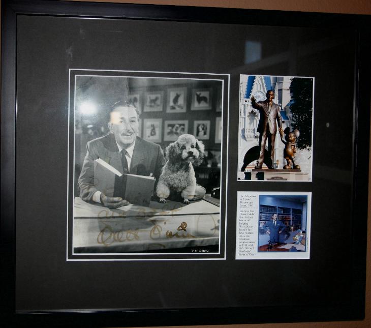 | This was the first Walt Disney autographed photo I bought back in 1997. I had held out for the longest time trying to find an autograph that wasn't personalized, and didn't have an animal in the photo. They seemed to be getting more expensive as the time went on, so I finally decided to buy this one. It was a bit of a disappointment when it came in the mail. The autograph had started to fade and there was a crease on the photo. But I framed it and it now hangs in my home office. |